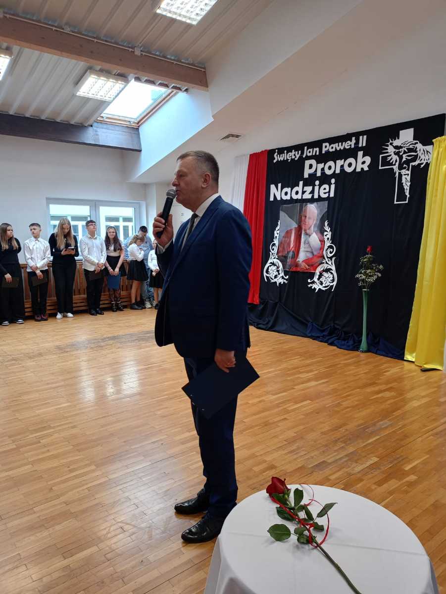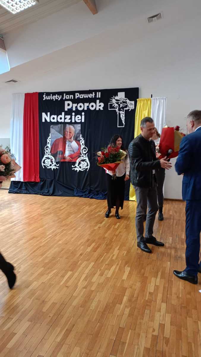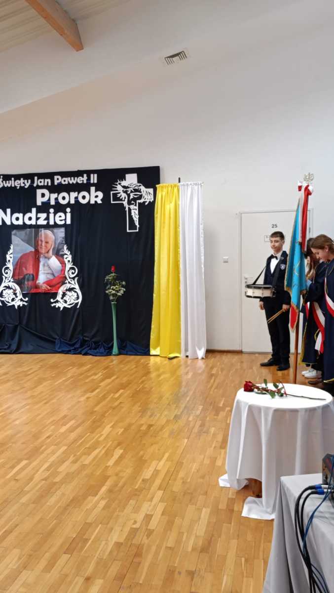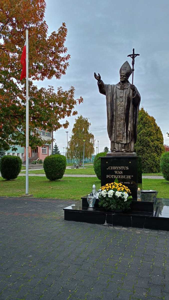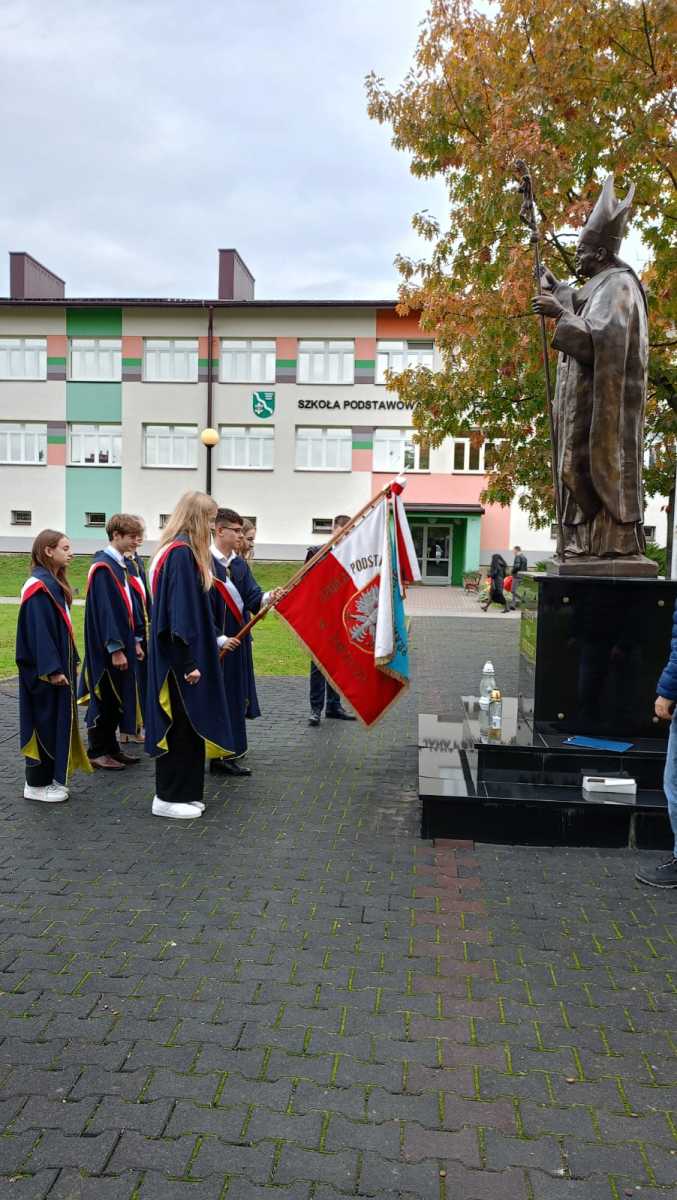 Przy figurze św. Jana Pawła II odbył się ceremoniał szkolny, został odśpiewany hymn państwowy, odmówiona modlitwa oraz złożone kwiaty.