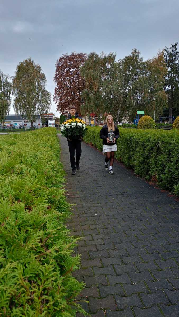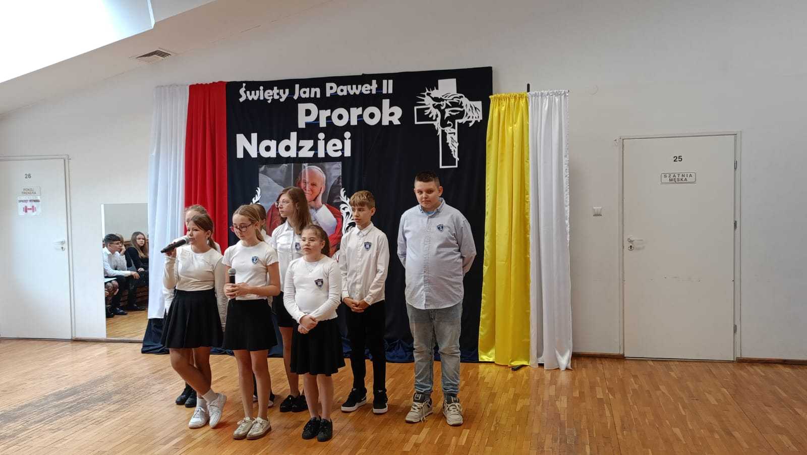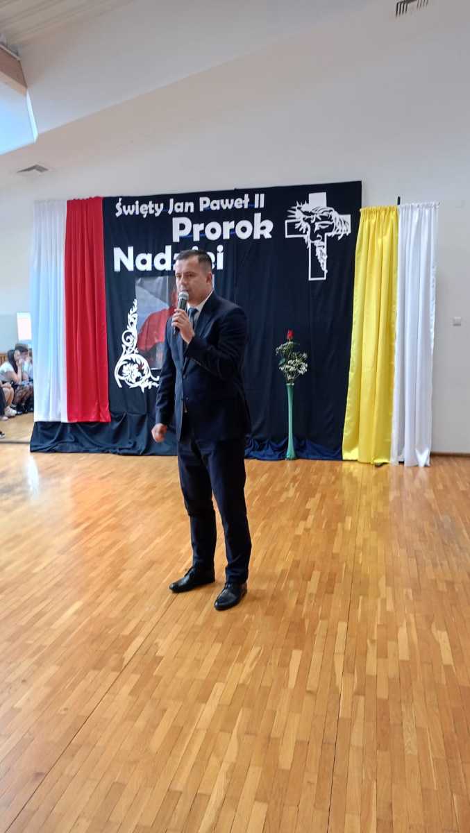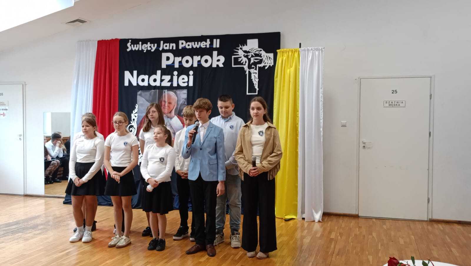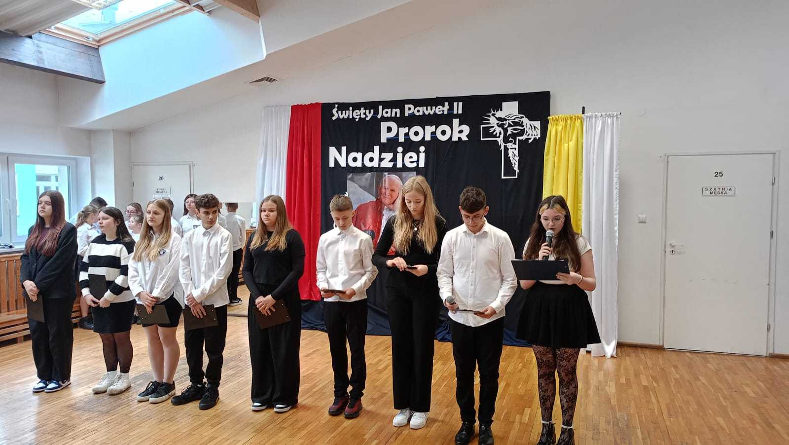 Przy figurze św. Jana Pawła II odbył się ceremoniał szkolny, został odśpiewany hymn państwowy, odmówiona modlitwa oraz złożone kwiaty.