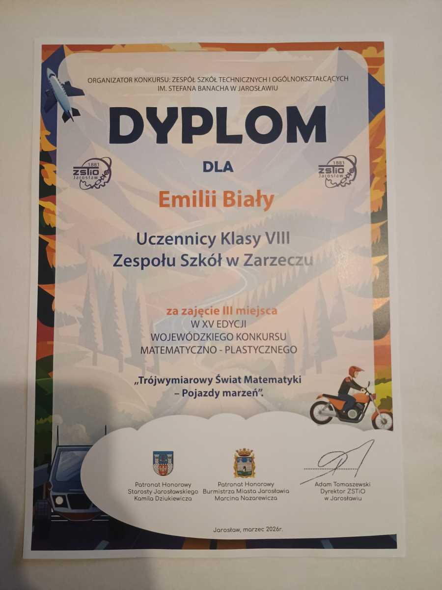 Z ogromną radością informujemy, że w wojewódzkim konkursie „Trójwymiarowy Świat Matematyki – pojazdy marzeń”, zorganizowanym przez ZSTiO w Jarosławiu, nasze uczennice osiągnęły wspaniałe wyniki!
