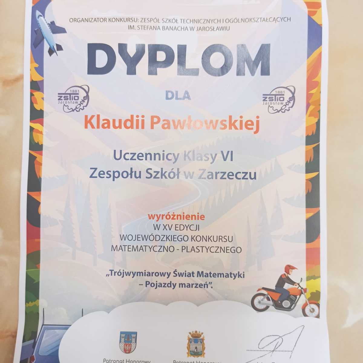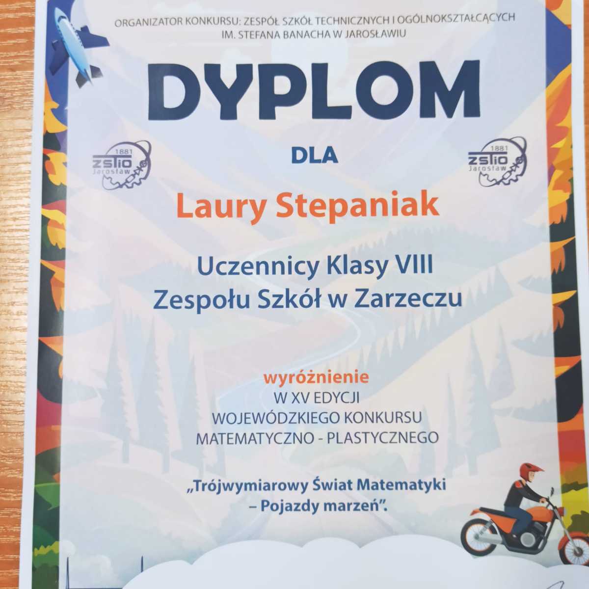 - Laura Stepaniak ( kl 8b) i jej praca „Motocykl Harley Davidson” oraz Klaudia Pawłowska (6a) z „Pojazdem z przyszłości” otrzymały wyróżnienia, które są dowodem ich zaangażowania i matematycznej wyobraźni.