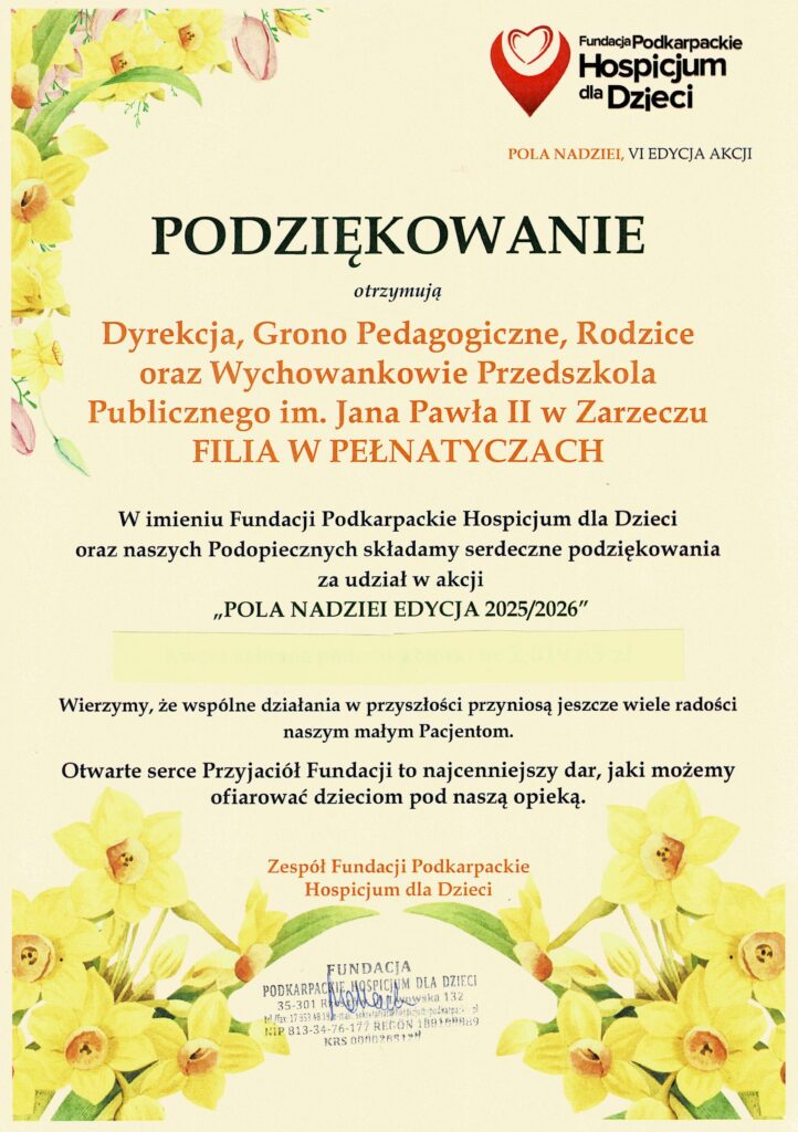 Serdecznie dziękujemy wszystkim Rodzicom za okazane wsparcie i zaangażowanie w akcję charytatywną „Pola Nadziei” na rzecz hospicjum dla dzieci.