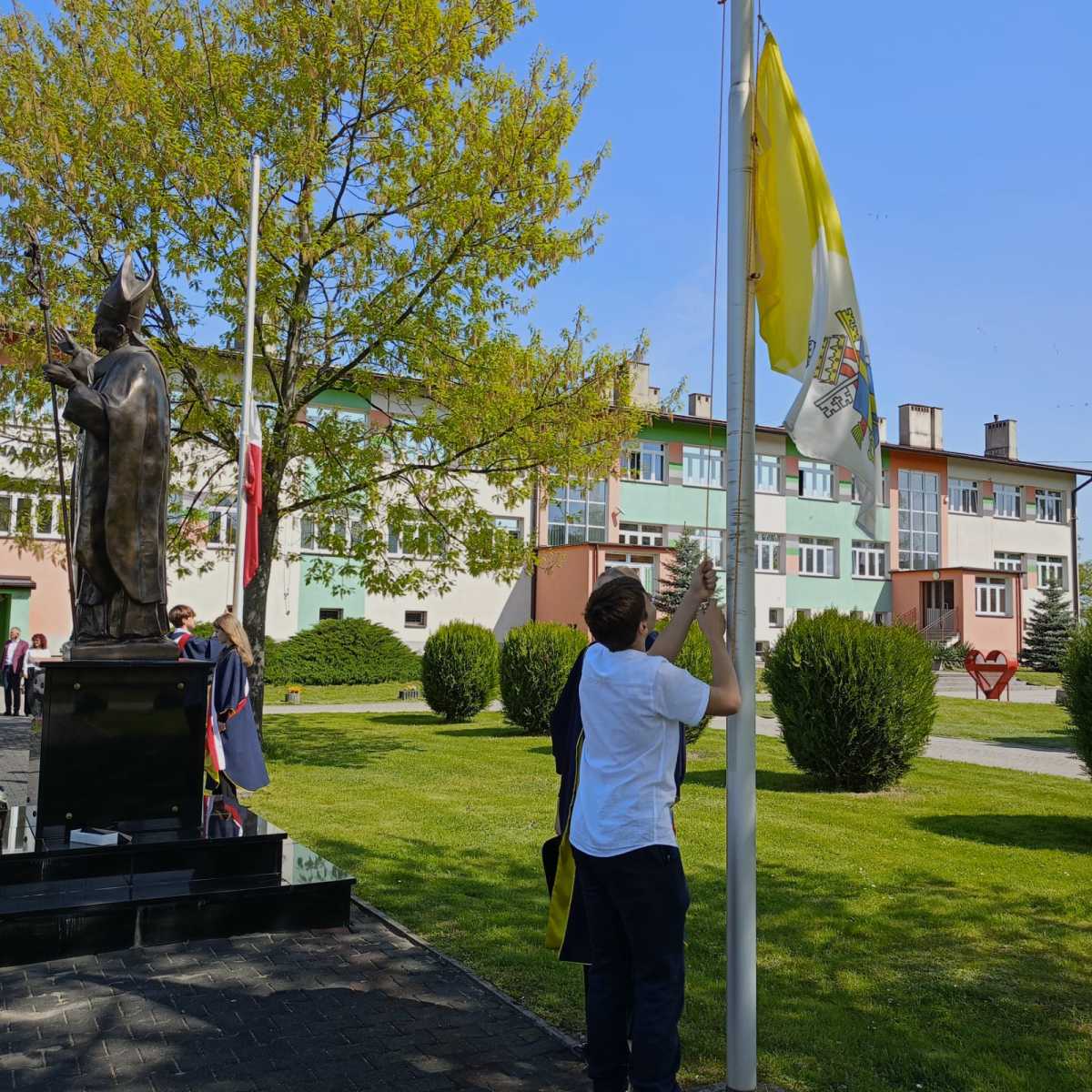 Wcześniej, zgodnie z ceremoniałem szkolnym, miały miejsce uroczystości pod figurą patrona szkoły. W ten sposób uczciliśmy nie tylko Święto Konstytucji 3 Maja, ale również Święto Matki Bożej Królowej Polski, Dzień Flagi Rzeczypospolitej Polskiej, Święto Pracy przypadające na 1 maja oraz kolejną rocznicę kanonizacji naszego patrona, świętego Jana Pawła II.